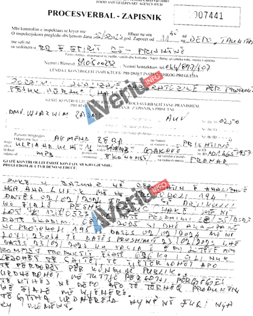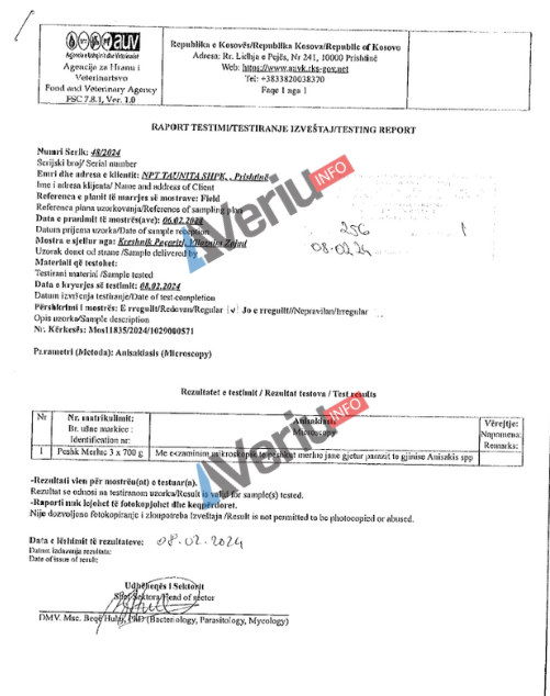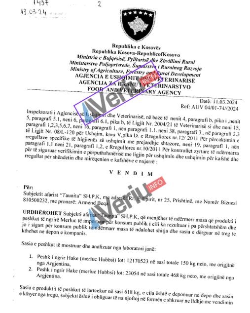 Veriu.info ka siguruar procesverbalin e inspektimit, të kompanisë “Taunita” nga inspektorët e Agjencisë së Ushqimit dhe Veterinarisë, raportimin e testimit, dhe vendimin e agjencisë me të cilin urdhërohet kompania të ndaloj shitjen e kësaj sasie të peshkut të ngrirë ‘Merluc’.