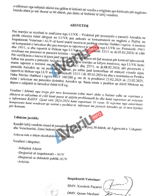 Në arsyetim të vendimit të AUV që është marrë nga inspektorët Kreshnik Paçarizi dhe Qenan Maxhuni, tregohet se analiza e peshkut për prezencë të parazitit ‘Anisakis’ është bërë pas ankesës së një konsumatori nga regjioni i Pejës, raporton Veriu.info.