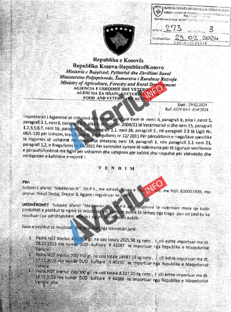 Në dokumentet e siguruara nga Veriu.info, shihet se AUV vitin e kaluar kishte gjetur mbi 35 mijë kilogram mish peshku të infektuar me krimba, sasi që ishte importuar nga Spanja dhe Maqedonia e veriut në Kosovë në fund të vitit 2023 nga kompania “DELFIN” L.T.D. Sh.P.K. me pronar Basri dhe Avni Krasniqi.
