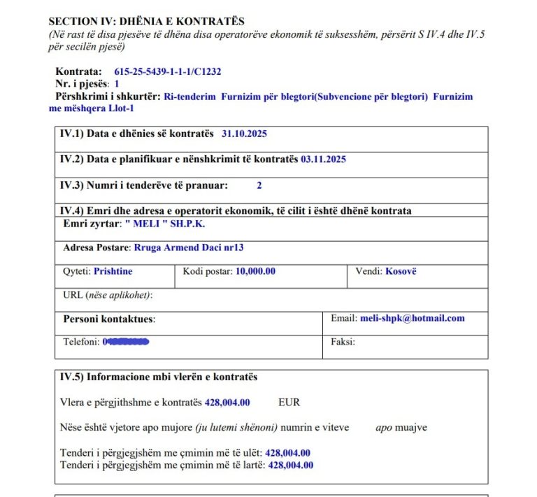 Në këtë tender që kanë konkuruar dy operatorë ekonomik, fitues është shpallur “Meli” Sh.P.K. që ka ofertuar me çmim prej 428 mijë e 4 euro, që nënkupton se komunës një mëshqerrë do t’i kushtojë 2 mijë 642 euro.