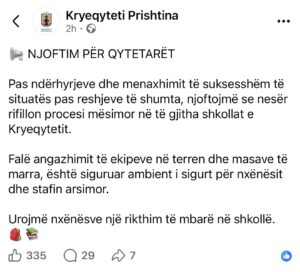 “Pas ndërhyrjeve dhe menaxhimit të suksesshëm të situatës pas reshjeve të shumta, njoftojmë se nesër rifillon procesi mësimor në të gjitha shkollat e Kryeqytetit. Falë angazhimit të ekipeve në terren dhe masave të marra, është siguruar ambient i sigurt për nxënësit dhe stafin arsimor. Urojmë nxënësve një rikthim të mbarë në shkollë”, thuhet në njoftimin e Komunës së Prishtinës.