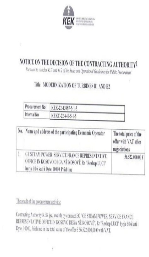 “Modernizimi i turbinave B1 dhe B2 të Termocentralit Kosova B”. Kështu quhet kontrata që do të lidhet në mes të KEK-ut dhe “GE Steam Power Service France Representative Office in Kosovo Dega në Kosovë”.