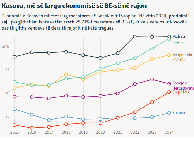 Ekonomia e Kosovës mbetet larg mesatares së Bashkimit Evropian. Në vitin 2024, prodhimi i saj i përgjithshëm ishte vetëm rreth 25.73% i mesatares së BE-së, duke e vendosur Kosovën pas të gjitha vendeve të tjera të rajonit në këtë tregues./REL/
