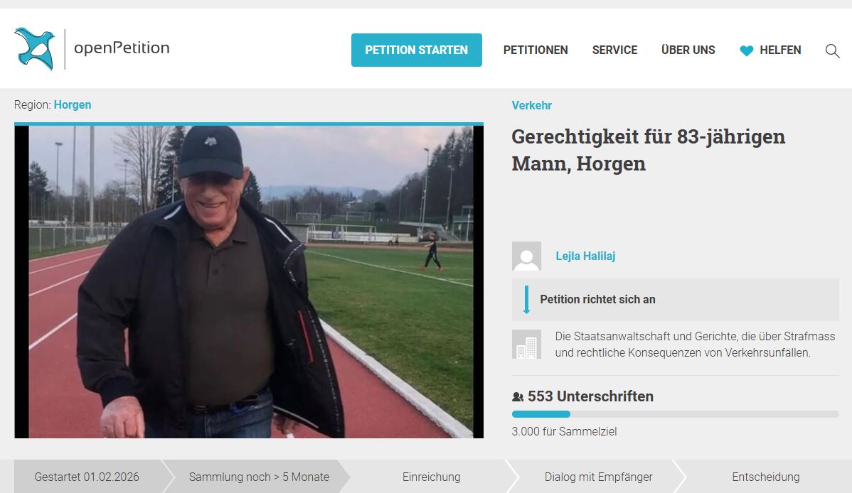 “Po ju shkruaj si e afërme e gjyshit tim, i cili në vitin 2023 u përplas për vdekje nga një makinë në një kalim për këmbësorë në Horgen. Ngjarja nuk na ka tronditur vetëm ne si familje, por ka lënë edhe një plagë të thellë në komunitetin tonë. Autori i aksidentit mori një dënim shumë të lehtë, i cili sipas mendimit tonë nuk është në përputhje me tragjedinë dhe humbjen e anëtarit tonë të dashur të familjes. Për këtë arsye, duam të tërheqim vëmendjen mbi këtë rast dhe kërkojmë drejtësi për gjyshin tonë. Për këtë qëllim, kemi nisur një peticion, të cilin dëshirojmë ta dorëzojmë tek publiku dhe autoritetet: