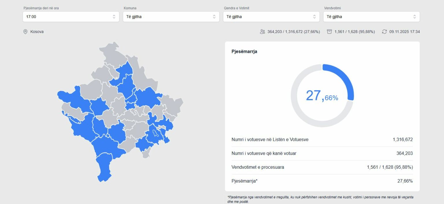 Sipas përditësimit të fundit, në 18 komunat që janë në balotazh kanë votuar 27.66 për qind apo 364.203 qytetarë.