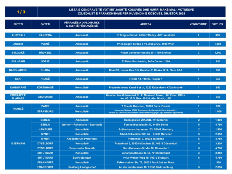 Në përgjithësi, numri i Qendrave të Votimit për votimin jashtë Kosovës, të miratuara nga KQZ është 60, me gjithsej 109 vendvotime. Ndërkaq, numri maksimal i votuesve që mund të regjistrohen për të votuar në këto Qendra të Votimit ëshë 103,550.