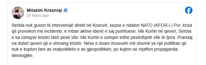 “Serbia nuk guxon të intervenojë direkt në Kosovë, sepse e ndalon NATO (KFOR-i.) Por, kriza që provokon me incidente, e mban aktive idenë e saj pushtuese. Me Kurtin në qeveri, Serbia e ka ushqyer krizën tash pesë vite. Me Kurtin e ushqen edhe pesëdhjetë vite të tjera. Prandaj na duhet qeveri që e shmang krizën. Nëse e duam Kosovën më shumë se një politikan që nuk e kupton fare as realpolitikën e as gjeopolitikën, po kujton se mjafton propaganda ideologjike”, ka shkruar Krasniqi.