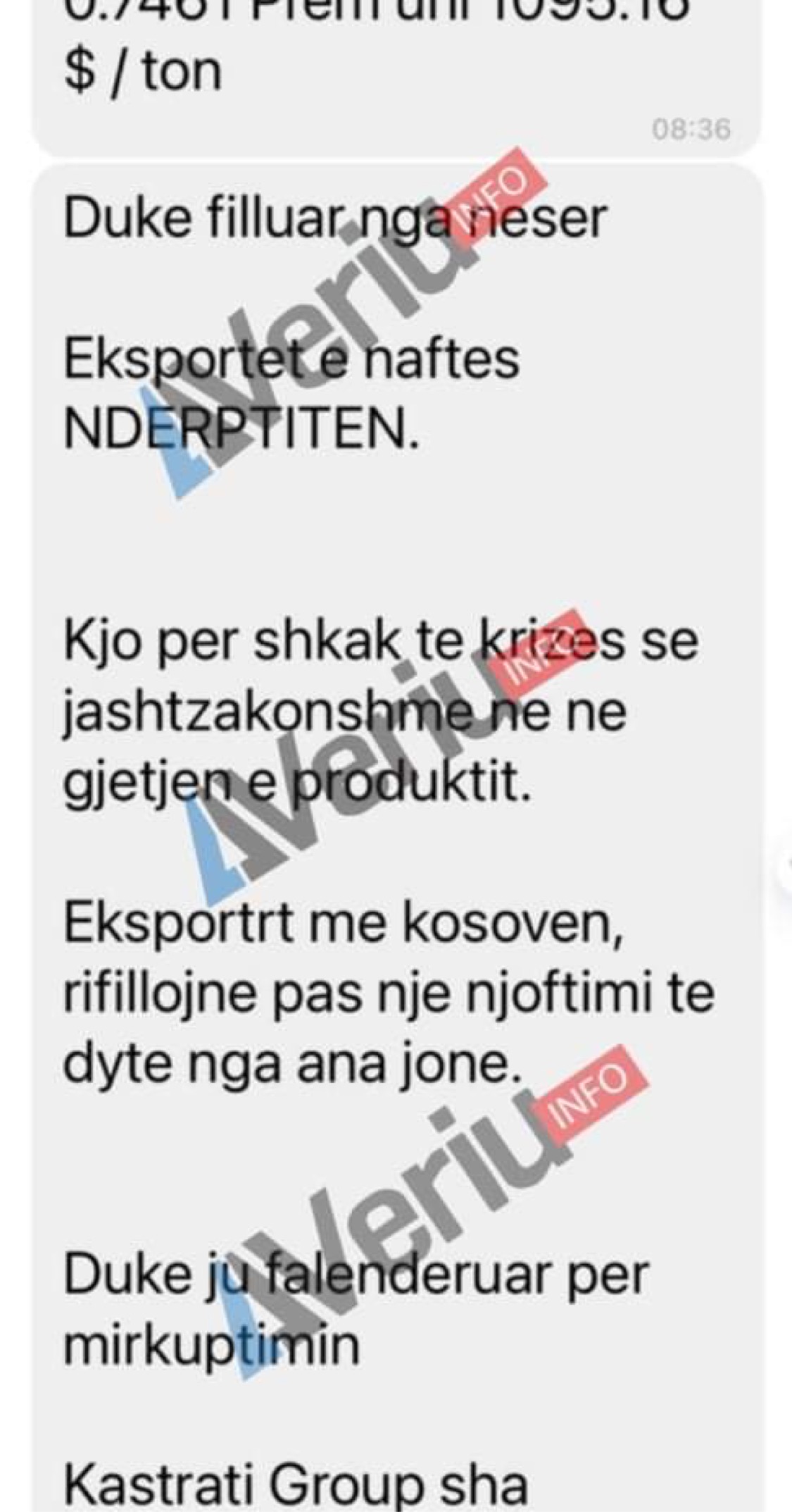 Veriu.info ka siguruar ekskluzivisht komunikimin intern mes Kastrati Group dhe kompanive kosovare ku ajo e para njofton se ka ndërprerë eksportet e naftës për Kosovën deri në një njoftim të radhës.