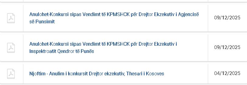 Konkursi për Drejtor Ekzekutiv në Inspektoratin e Punës, Drejtor Ekzekutiv të Thesarit të Kosovës si dhe ai për Drejtor Ekzekutiv të Agjencisë së Punësimit, janë shfuqizuar pas vendimeve të Këshillit të Pavarur Mbikëqyrës për Shërbimin Civil të Kosovës, për shkak të shkeljeve ligjore në procedurat e rekrutimit dhe mungesës së kompetencës institucionale.