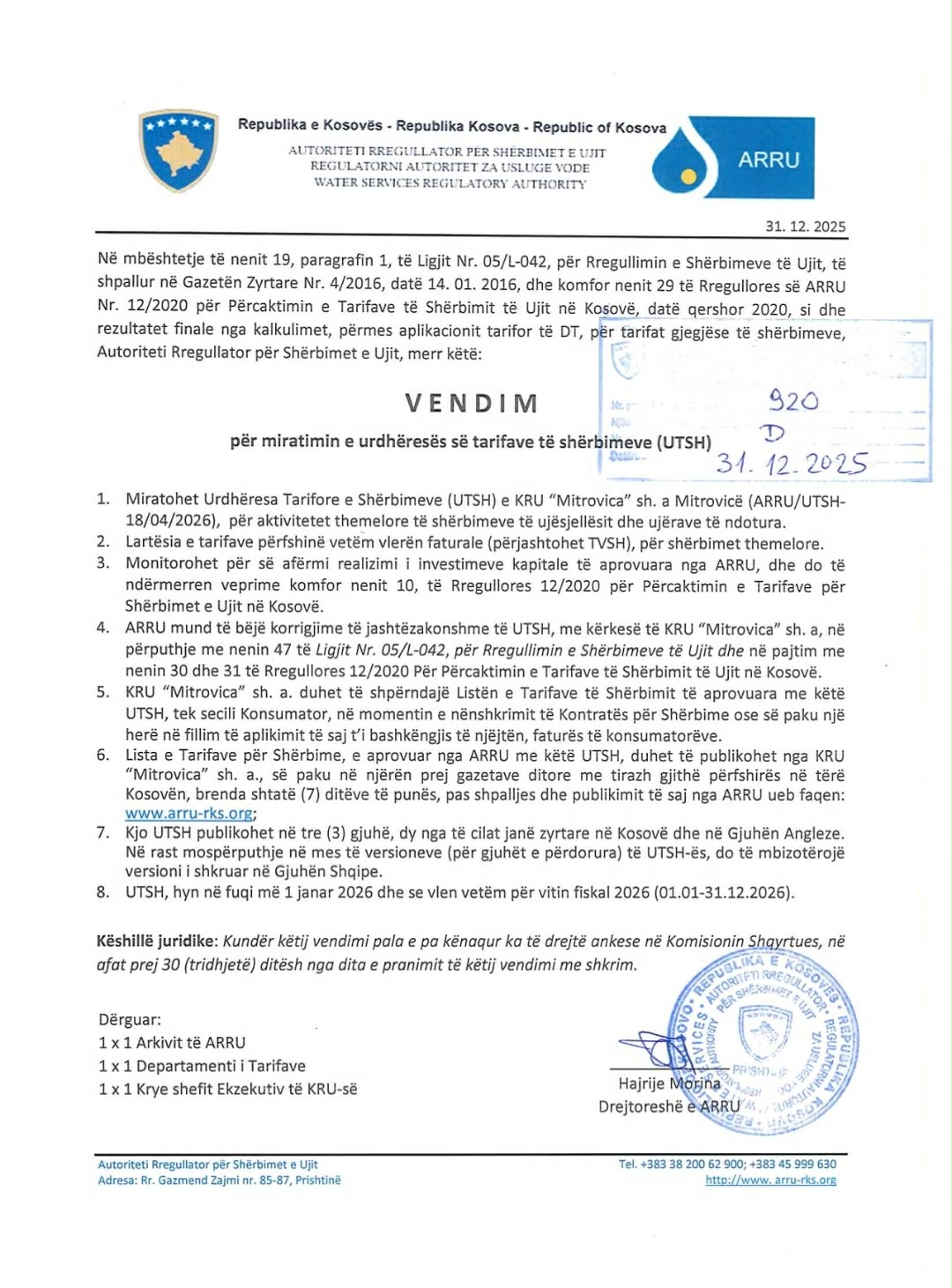 Autoriteti i Rregullatorit për Shërbimet e Ujit me 31 dhjetor 2025 kq marrë vendim për tarifat e reja të ujit, duke bërë rritje të tyre nën arsyetimin e ndryshimebe ekonomike që kanë ndikuar në rritjen e kostos së furnizimit.