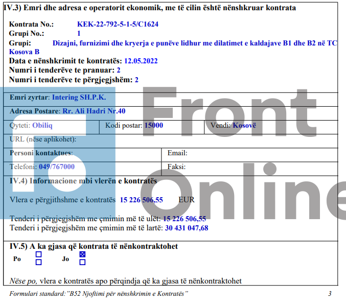 Gjithsej 15.2 milionë KEK-u ia dha një kompanie për dizajnin, furnizimin dhe kryerjen e punëve lidhur me dilatimet e kaldajave B1 dhe B2 në TC Kosova B.