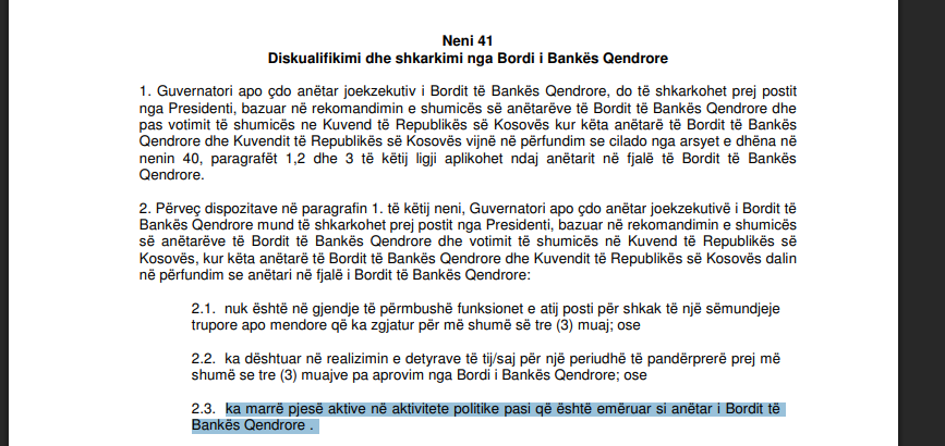 “2.3. ka marrë pjesë aktive në aktivitete politike pasi që është emëruar si anëtar i Bordit të Bankës Qendrore.”, thuhet në piken 2.3 te nenit 41.
