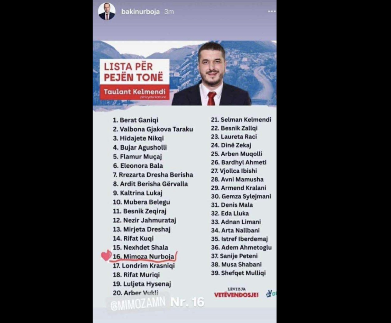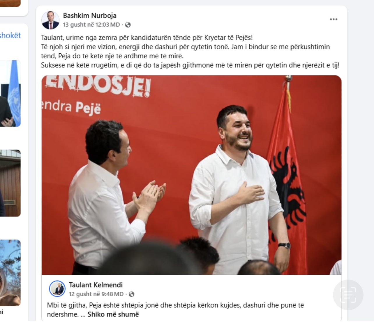 “Taulant, urime nga zemra për kandidaturën tënde për Kryetar të Pejës! Të njoh si njeri me vizion, energji dhe dashuri për qytetin tonë. Jam i bindur se me përkushtimin tënd, Peja do të ketë një të ardhme më të mirë. Suksese në këtë rrugëtim, e di që do ta japësh gjithmonë më të mirën për qytetin dhe njerëzit e tij!”, ka shkruar Nurboja.
