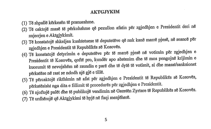 “Të konstatojë detyrimin e deputetëve për të marrë pjesë në votimin për zgjedhjen e Presidentit të Kosovës, qoftë pro, kundër apo abstenim dhe të mos pengojnë krijimin e kuorumit të nevojshëm në raundin e parë dhe të dytë të votimit, si dhe masat/sanksionet përkatëse në rast se ndodh një gjë e tillë.”, thuhet në shkresë.