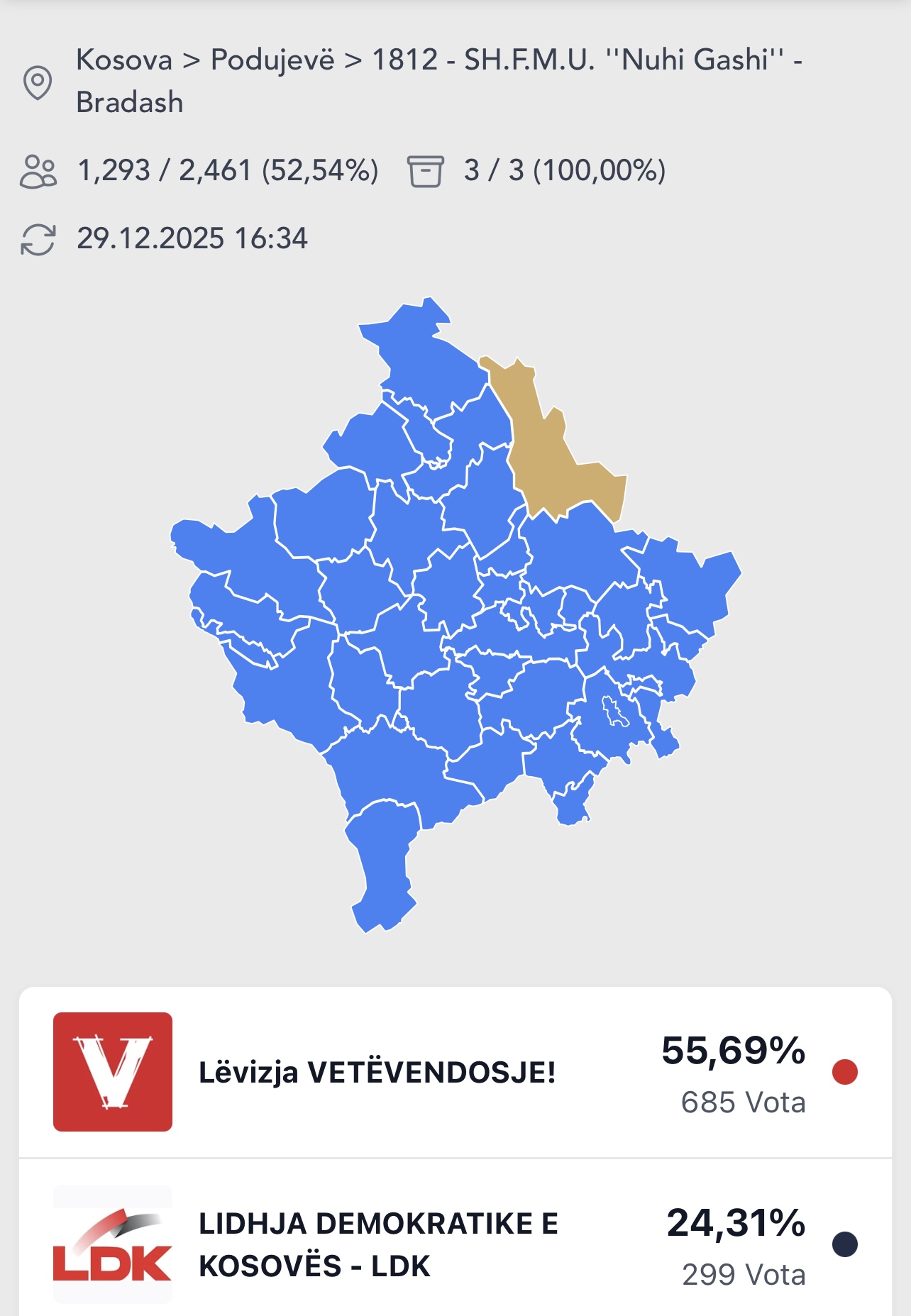Sipas të dhënave zyrtare të KQZ-së, në Bradash ka fituar bindshëm LVV ku ka marrë 55.69% të votave, pasuar nga LDK me 24.31%, raporton Gazeta Online Veriu.info.