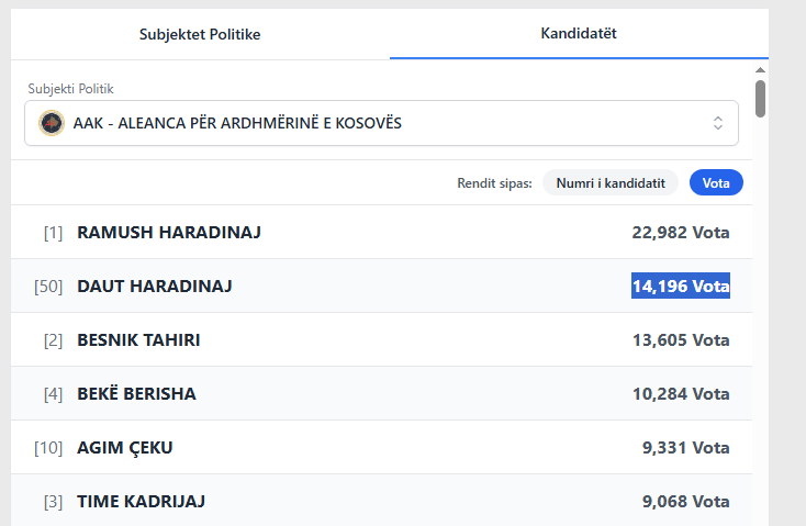 Deri më tani është bërë numërimi i mbi 60% të votave. I pari më i votuari në këtë parti është Ramush Haradinaj me 22,982 vota, pas tij Daut Haradinaj me 14,196 vota. Foto: <img src="https://veriu.info/wp-content/uploads/2025/12/IMG_1454.png" alt="" width="734" height="479" class="aligncenter size-full wp-image-332598" />
