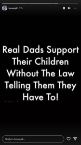 “Baballarët e vërtetë i mbështesin fëmijët e tyre pa iu thënë ligji që duhet t’i mbështesin.”, ka shkruar ajo.