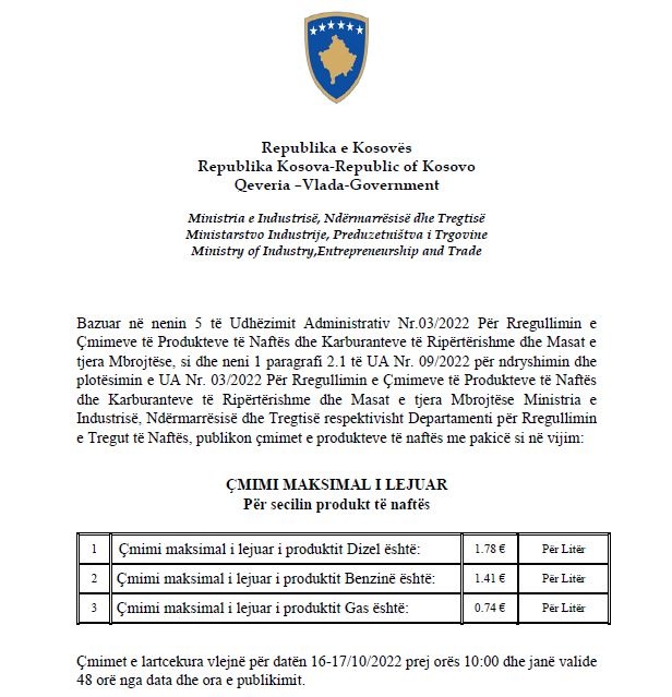 Ministria e Industrisë, Ndërmarrësisë dhe Tregtisë, dje ka publikuar çmimet e derivateve për dy ditë të cilat do të vlejnë deri nesër në ora 10:00.
