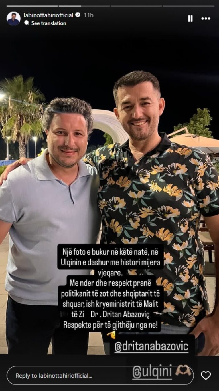 Në një fotografi të publikuar së fundmi në Instagram Story, ai shfaqet përkrah politikanit shqiptar nga Mali i Zi, Dritan Abazoviq – ish-kryeministër i vendit.