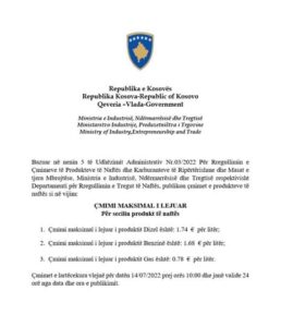 Siç njofton ministria, çmimi maksimal i lejuar për secilin produkt të naftës është shtrenjtuar për një centë dhe do të jetë 1.74 euro për litër.