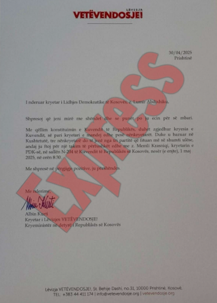 Kryeministri në detyrë i Republikës së Kosovës dhe njëherësh kryetar i Lëvizjes Vetëvendosje, Albin Kurti, i ka dërguar një letër zyrtare kryetarit të Lidhjes Demokratike të Kosovës (LDK), Lumir Abdixhiku, përmes së cilës e fton në një takim konsultativ me qëllim të konstituimit të Kuvendit të ri.