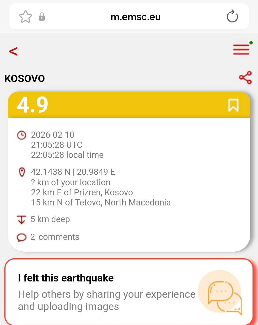 Një tërmet ka ndodhur në Kosovë para pak minutash, raporton Gazeta Online Veriu.info.