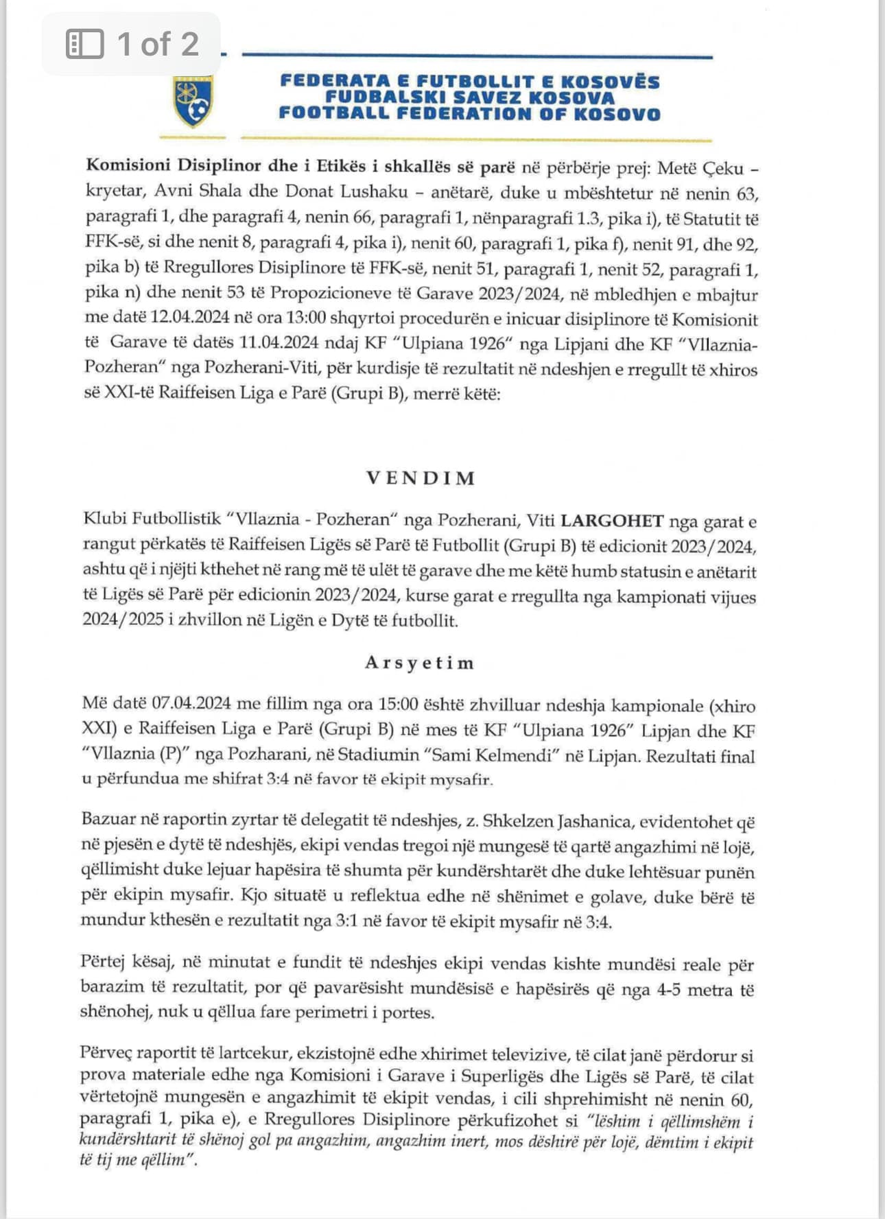 Ulpiana dhe Vllaznia janë përjashtuar nga gara në Ligën e Parë të Kosovës.