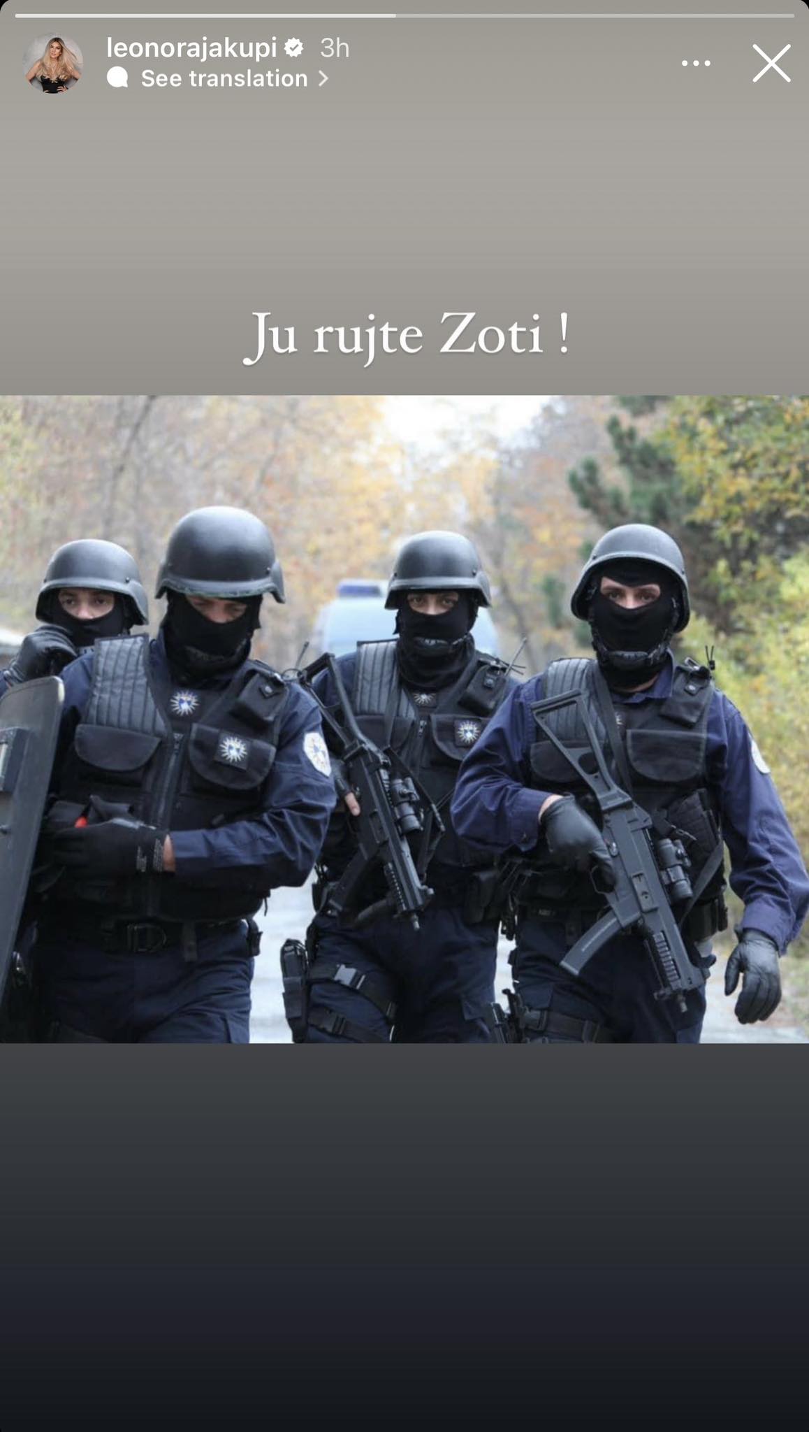 Këngëtarja Leonora Jakupi ka lënë në faqen e saj në Instagram një postim me prestarët e Njesisë Speciale me lutjen që ti ruaj Zoti.