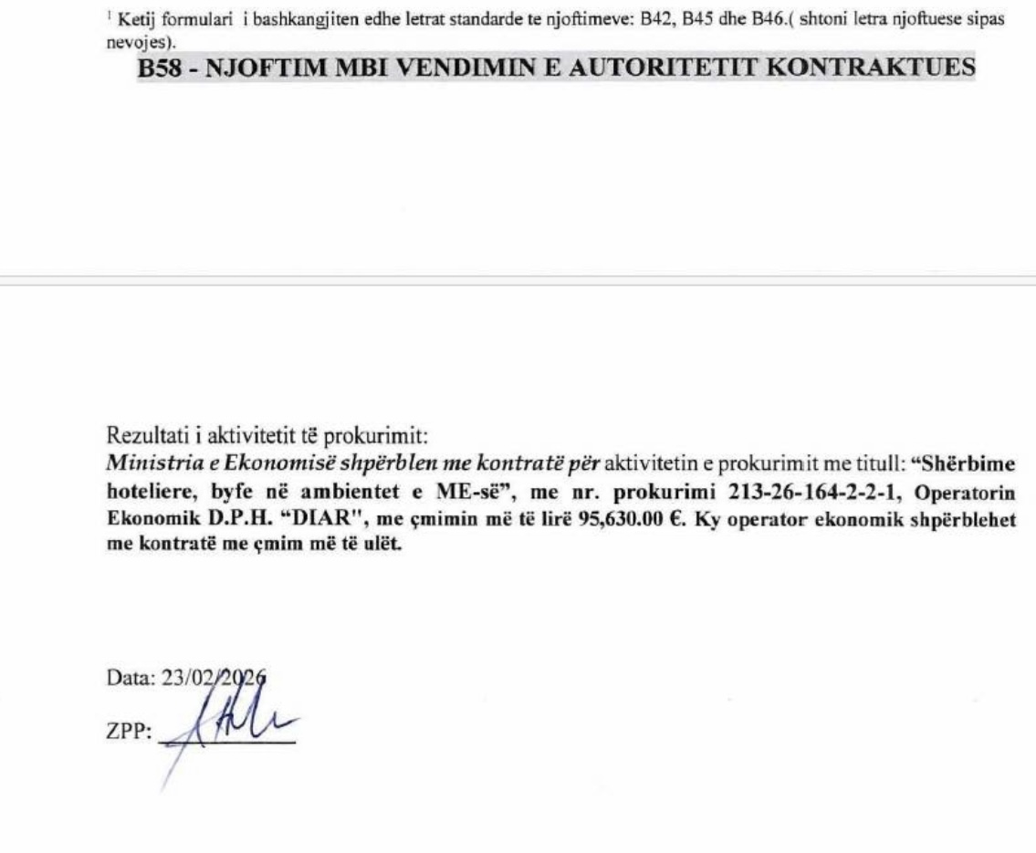 Ky tender me titull “shërbime hoteliere, byfe në ambientet e ME-së” , i është dhënë operatorit ekonomik D.P.H “Diar” i cili ka ofruar çmimin 95 mijë e 630 euro.