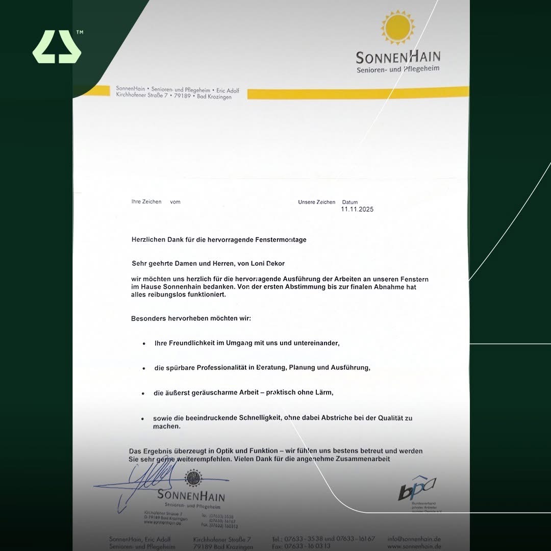 Dëshirojmë t’ju shprehim falënderimet tona më të sinqerta për realizimin e jashtëzakonshëm të punimeve në dritaret tona në shtëpinë SonnenHain. Nga koordinimi fillestar e deri te pranimi përfundimtar, gjithçka funksionoi në mënyrë të përkryer dhe pa asnjë pengesë.