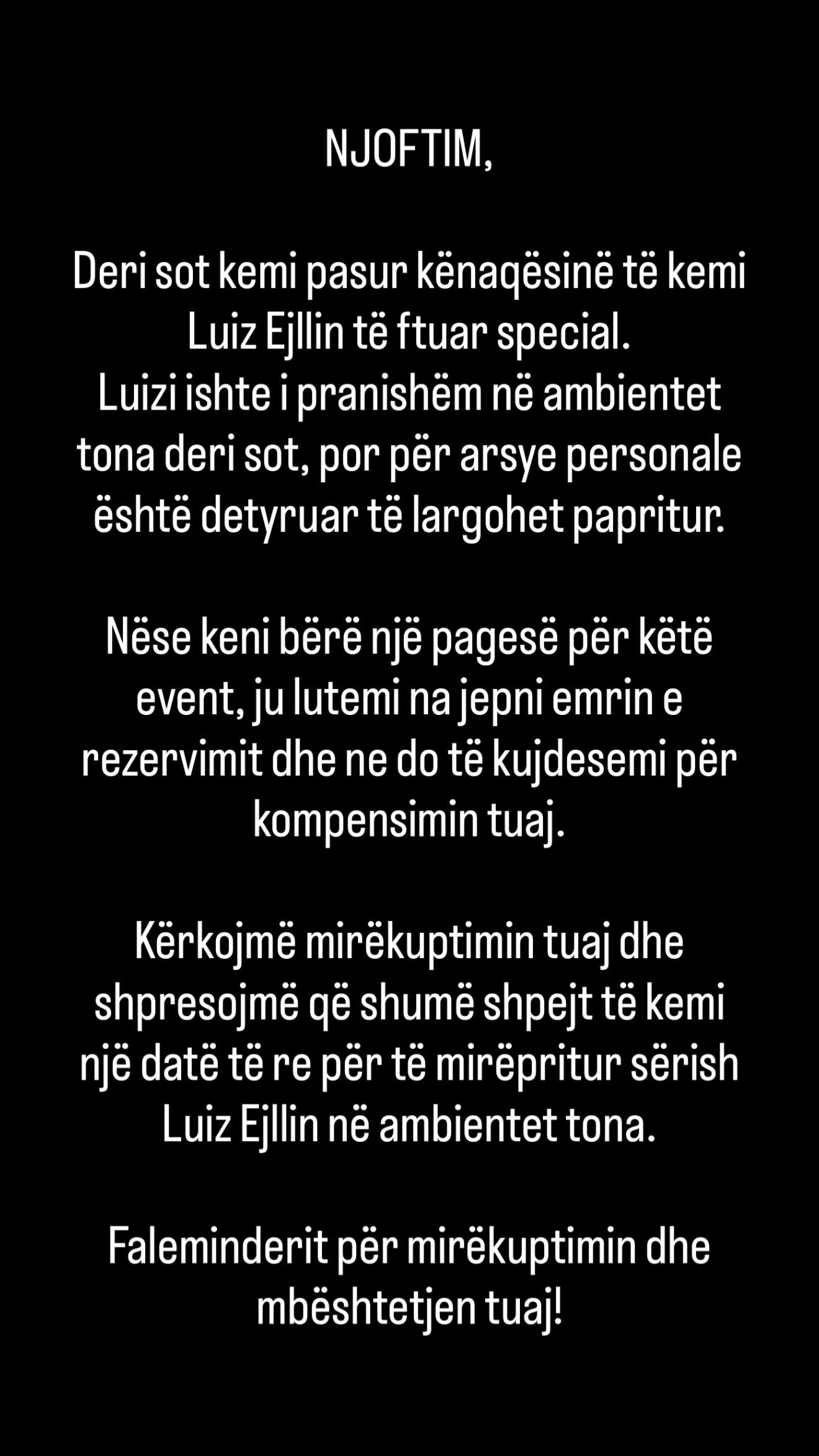 Lajmi është konfirmuar nga vetë organizatorët përmes një njoftimi zyrtar, ku thuhet se Luizi ishte i pranishëm në ambient deri sot, por një emergjencë personale e detyroi atë të largohet menjëherë.