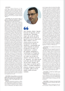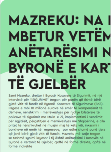 Sami Mazreku, drejtor i Byrosë Kosovare të Sigurimit në një intervistë për “iSIGURIME” tregon për punën që është bërë gjatë vitit të fundit të Byronë Kosovare të Sigurimeve (BKS). Pagesa e mbi 10 milionë euro në emër të kompensimit të dëmeve, nënshkrimi i marrëveshjes për njohjes bilaterale të policave të sigurimit me Mali e Zi, implementimi i vendimit për ngjitësit, përgatitjen e marrëveshjes me Shqipërinë, e cila pritet te nënshkruhet ne muajin maj të këtij viti, inkasimit të borxheve në emër të regreseve, por edhe shumë pune tjera që janë bërë gjatë vitit të fundit. Mazreku më tutje tregon se tashmë synimi kryesor i tij është anëtarësimi i Kosovës në Byronë e Kartonit të Gjelbër qoftë në formë direkte, qoftë në formë indirekte
