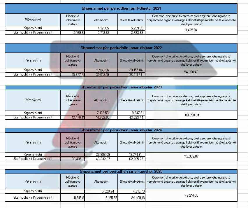 Në gjashtëmujorin e parë të vitit 2025, shpenzimet janë tashmë domethënëse. Kryeministri hargjoi mbi 10 mijë euro, ndërsa stafi politik ka realizuar shpenzime që tejkalojnë 41 mijë euroshin. Edhe pse është vetëm gjysma e vitit, për ngjarje e dreka e darka janë shpenzuar mbi 48 mijë euro.