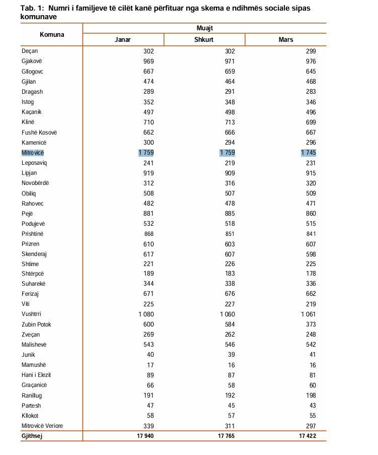 Me numër më të madh të familjeve me asitencë sociale dhe në mars të këtij viti, vazhdon të jetë Mitrovica me 1 mijë e 745 raste, pasuar nga Vushtrria me 1 mijë e 061 arste.