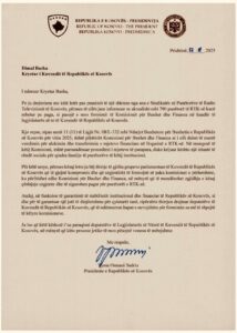 Presidentja e Kosovës, Vjosa Osmani, i është drejtuar me një letër Kryetarit të Kuvendit, Dimal Basha, lidhur me çështjen e pagave të punëtorëve të Radio Televizionit të Kosovës (RTK).