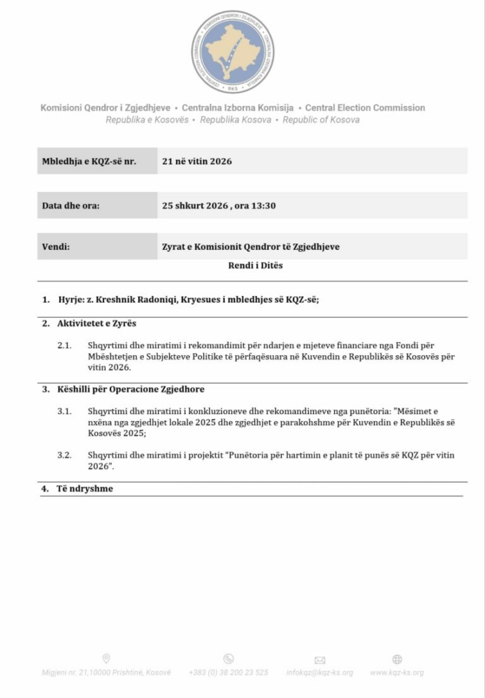 Në pikat tjera të rendit të ditës janë edhe shqyrtimi i rekomandimeve nga mësimet e nxëna për zgjedhjet lokale 2025 dhe zgjedhjet parlamentare 2025.