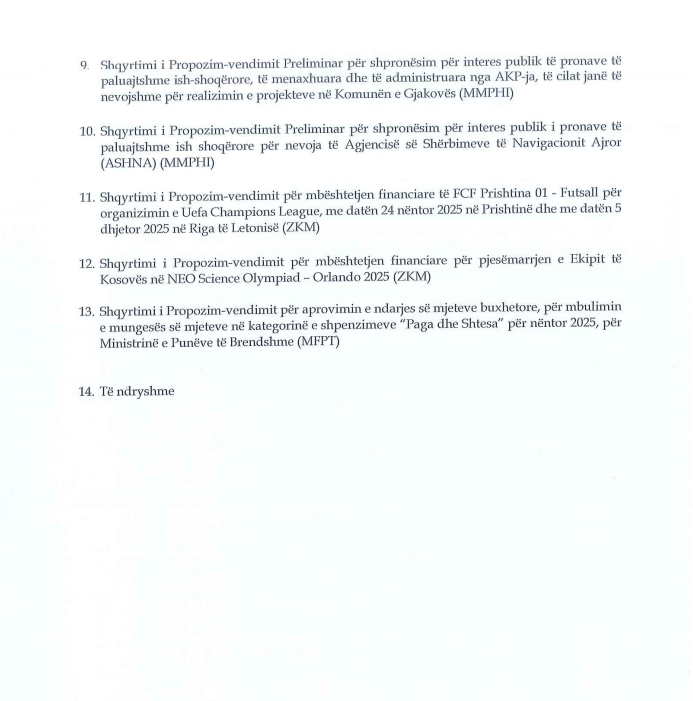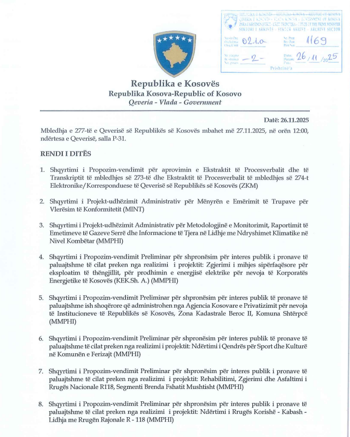 Në mbledhjen e ekzekutivit sot pritet të shqyrtohen propozim-vendimet për disa shpronësime. Po ashtu sot kabineti qeveritar në detyrë pritet të shqyrtojë propozim-vendimin për ndarjen e mjeteve buxhetore në kategorinë e shpenzimeve “paga dhe shtesa” për nëntor 2025 për Ministrinë e Punëve të Brendshme.