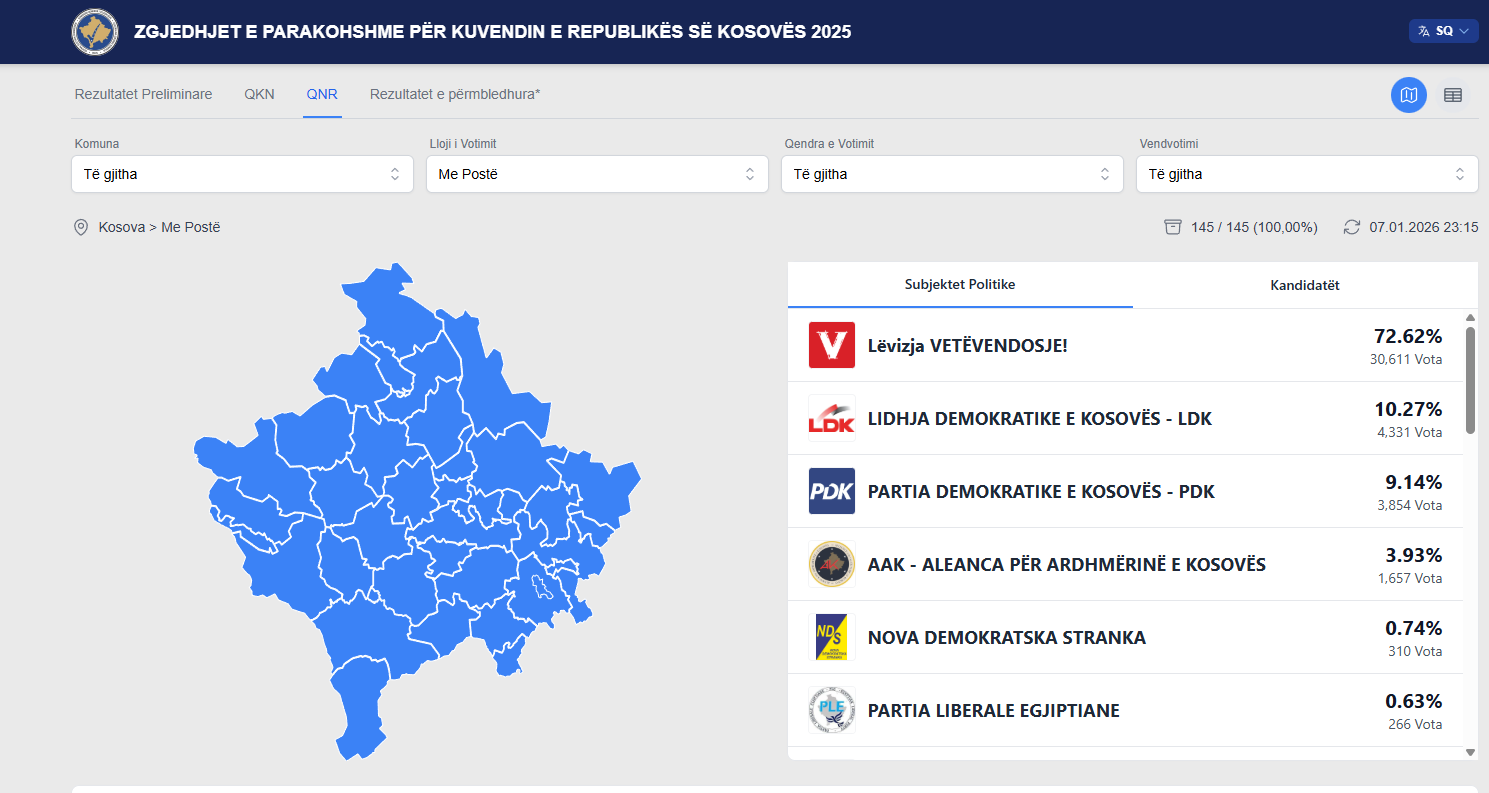Sipas të dhënave zyrtare, janë procesuar 145 nga 145 vendvotime, ose 100 për qind e totalit.