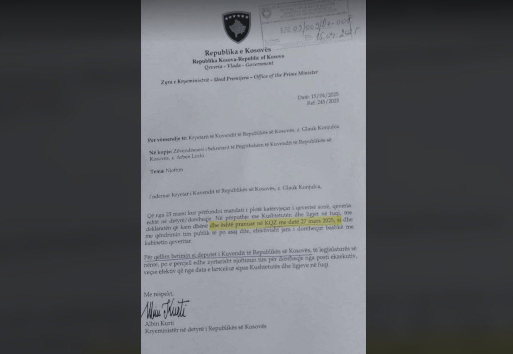 “I nderuar Kryetar i Kuvendit të Republikës së Kosovës, z. Glauk Konjufca, Që nga 23 marsi kur përfundoi mandati i plotë katërvjeçar i qeverisjes sonë, qeveria është në detyrë/dorëheqje. Në përputhje me Kushtetutën dhe ligjet në fuqi, me deklaratën që kam dhënë dhe është pranuar në KOZ me datë 27 mars 2025, dhe me qëndrimin tim publik të po asaj dite, efektivisht jam i dorëhequr bashkë me kabinetin qeveritar”, është thënë në letër, duke dhënë disa detaje tjera.
