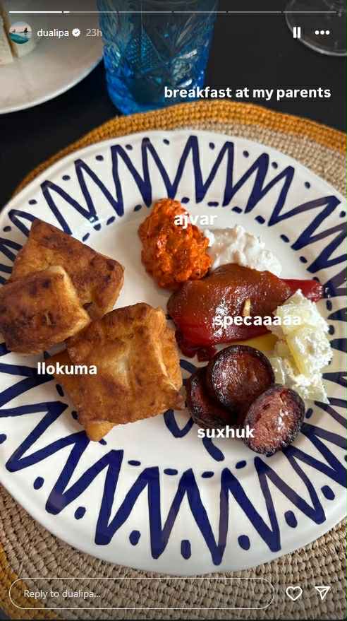 Në një postim në InstaStory, artistja 28-vjeçare publikoi një foto të një mëngjesi tradicional shqiptar, të përbërë nga suxhuk, vezë të fërguara, speca dhe petulla të freskëta – një kombinim që për shumë shqiptarë ngjall kujtime të fëmijërisë dhe familjes.