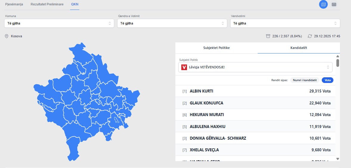 Në KQZ janë prcesuar 8.84% të votave nga numërimi i votave të kandidatëve për deputet. Kryetari i Lëvizjes Vetëvendosje, Albin Kurti deri tani ka marrë 29 mijë e 315 mijë vota.