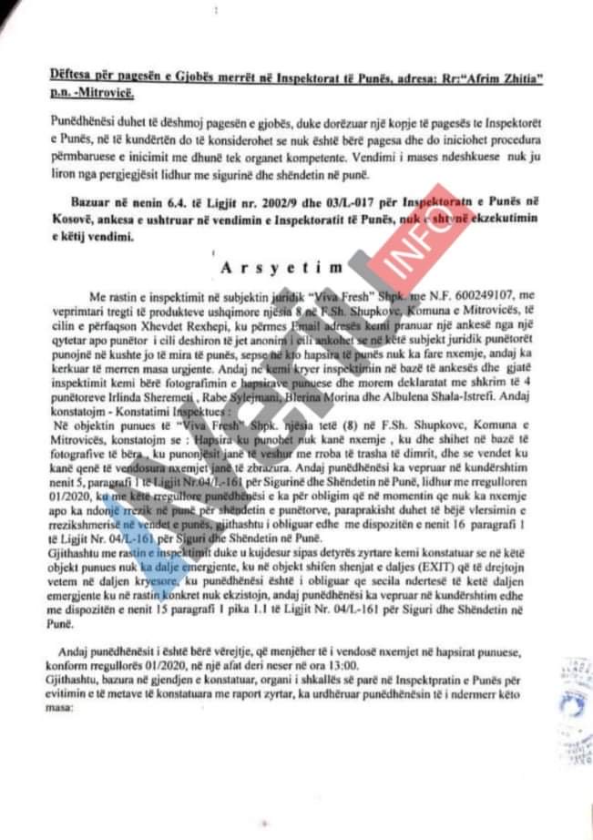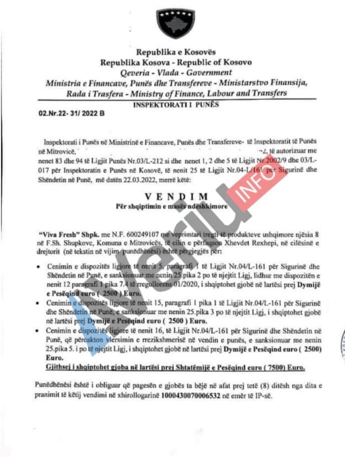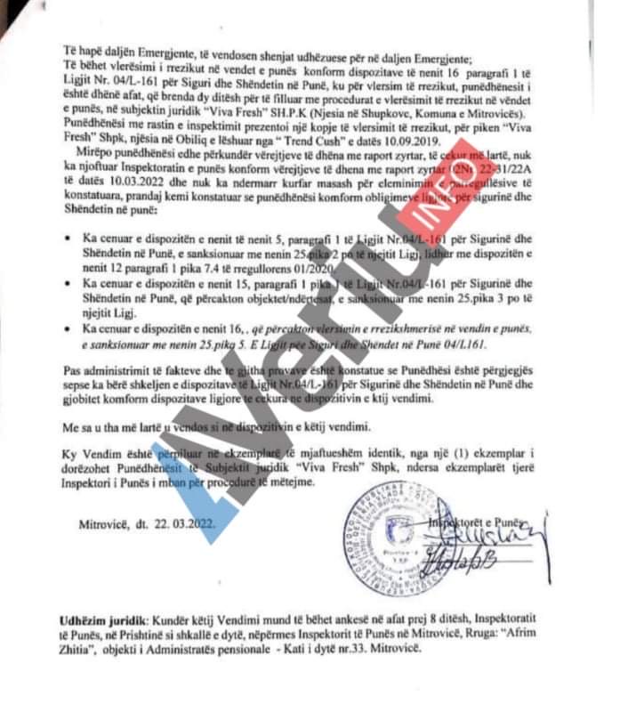 Bazuar në këtë inspektim të kryer më 10 mars 2022 Inspektorati i Punës ka nxjerrë gjobë për marketin “Viva Fresh” i përfaqësuar nga drejtori Xhevdet Rexhepi.