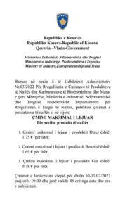 Ministria e Industrisë, Ndërmarrësisë dhe Tregtisë ka publikuar limitin për çmimet e derivative për 24 orët e ardhshme.