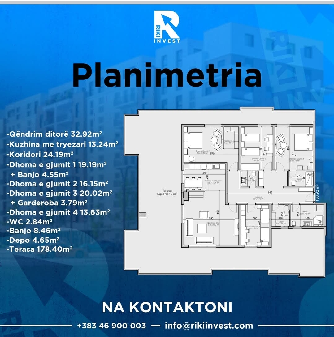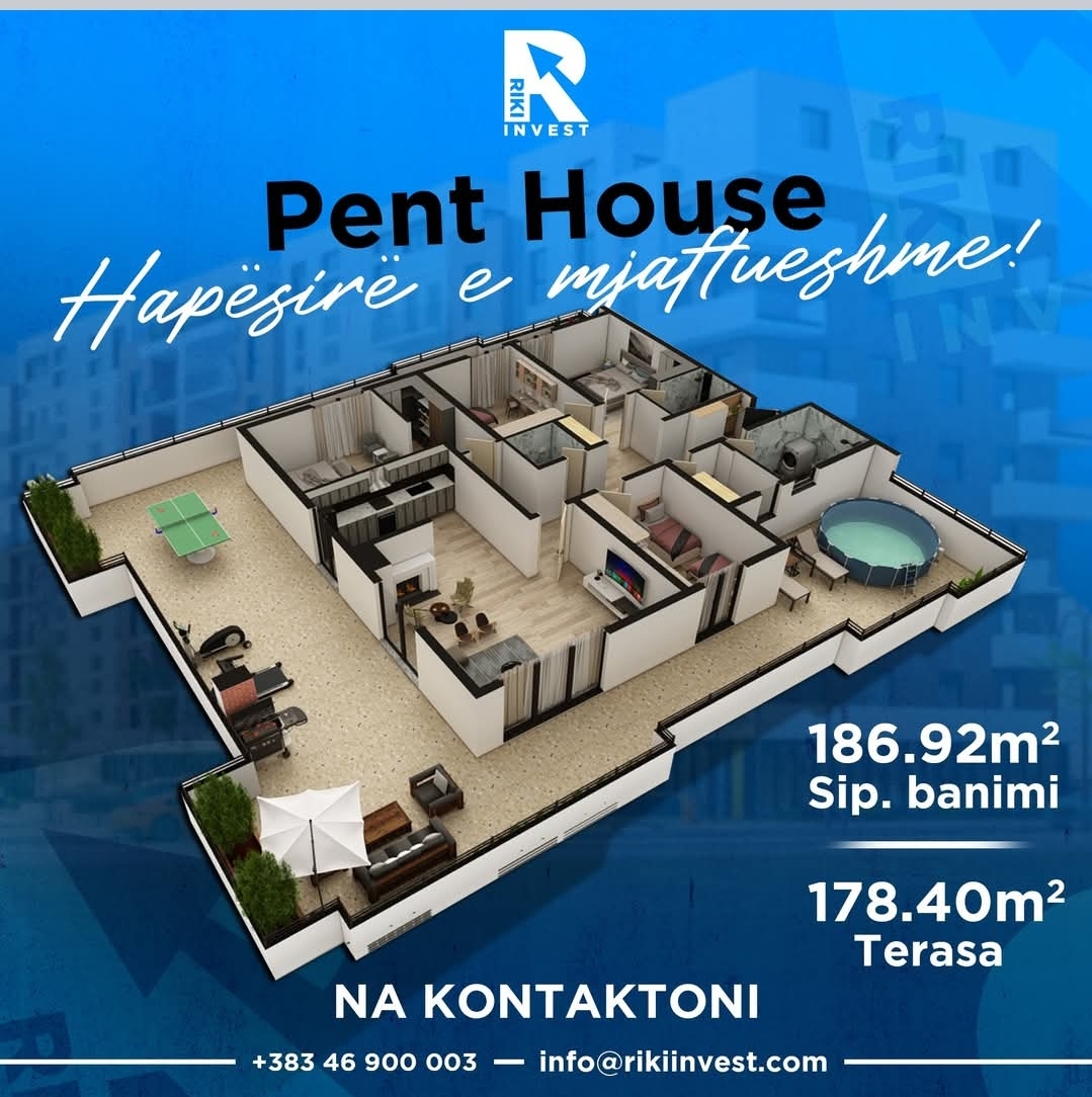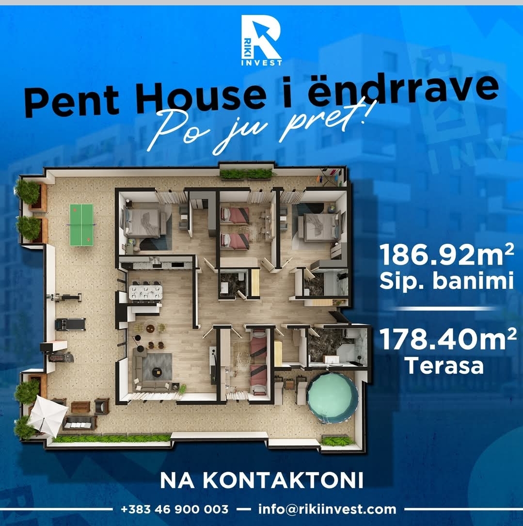 Një mundësi të tillë ua jep kompania ndërtimore Riki Invest, te e cila mund të bleni Penthouse me një sipërfaqe totale prej 186.92 m² dhe një tarasë madhështore prej 178.40 m².