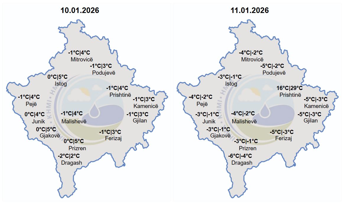 May be a graphic of map and text that says ‘10.01.2026 11.01.2026 -1/4 Mitrovicë -1℃3C Podujevë 05 Istog -1°C|4°C Pejë -4°C|-2°C Mitrovicë -5°Cl-2℃ Podujevë -3Cp1 Istog -1°℃4℃ Prishtinë -1°C|3°C Kamenicë -1°C3°C Gjilan -1°C4℃ Malisheve -4°C|-2°C Pejë 0°C|4°C エ Junik 0Cl5c Gjakovë 0C15c Prizren -2°C/2°C Dragash -13 Ferizaj 16°C|29°C Prishtinë -5°Cl-3℃ Kamenicë -5-3 Gjilan -3°Cl-1°C -4°C|-2°C Junik Malishevë -3°Cl-1°℃ Gjakovë -3°C|-1°C Prizren -6Cp-4 Dragash -5°C-3°C Ferizaj’