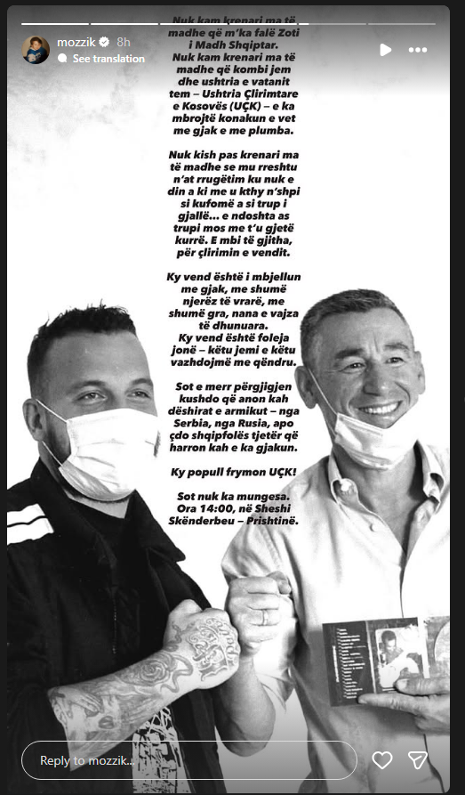Reperi i njohur kosovar, Mozzik, ka reaguar me një mesazh të fuqishëm në rrjetet sociale, duke shprehur krenarinë e tij për Ushtrinë Çlirimtare të Kosovës dhe sakrificën për lirinë e vendit.