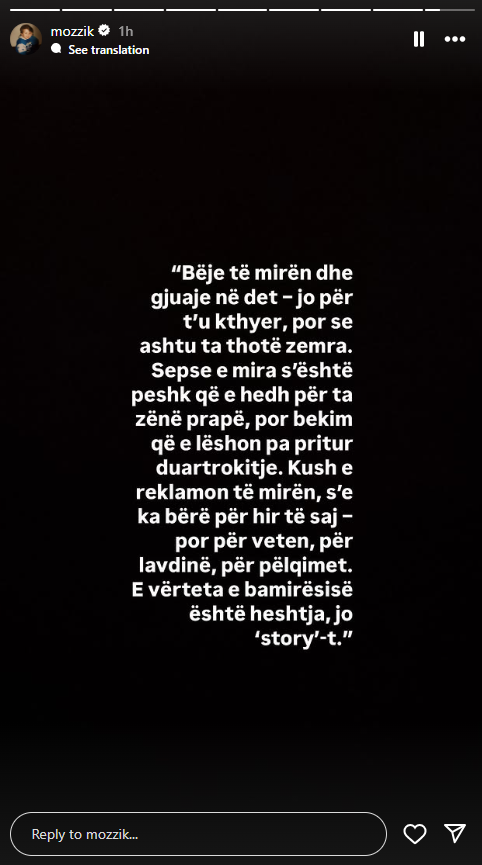 E vërteta e bamirësisë është heshtja, jo ‘story’-t”“, thuhet në reagimin e Mozzikut në ‘Instagram’.