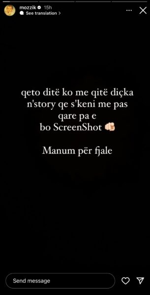 ”Qeto ditë ko me qitë diçka n’story që s’keni me pas qare pa e bo screenshot. Manum për fjale. Se kurrë ska ndodhë deri sot as n’Shqiptari e as n’botë”, ka shkruar Mozzik në Instagram.