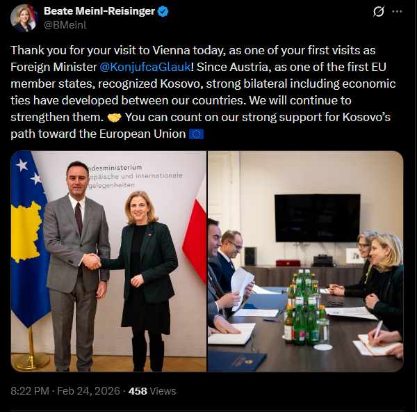 Pas kësaj, ka reaguar Beate Meinl-Reisinger, e cila ka faënderuar Konjufcën për vizitën në Austri, ndër të parat si mnistër i Jashtëm.