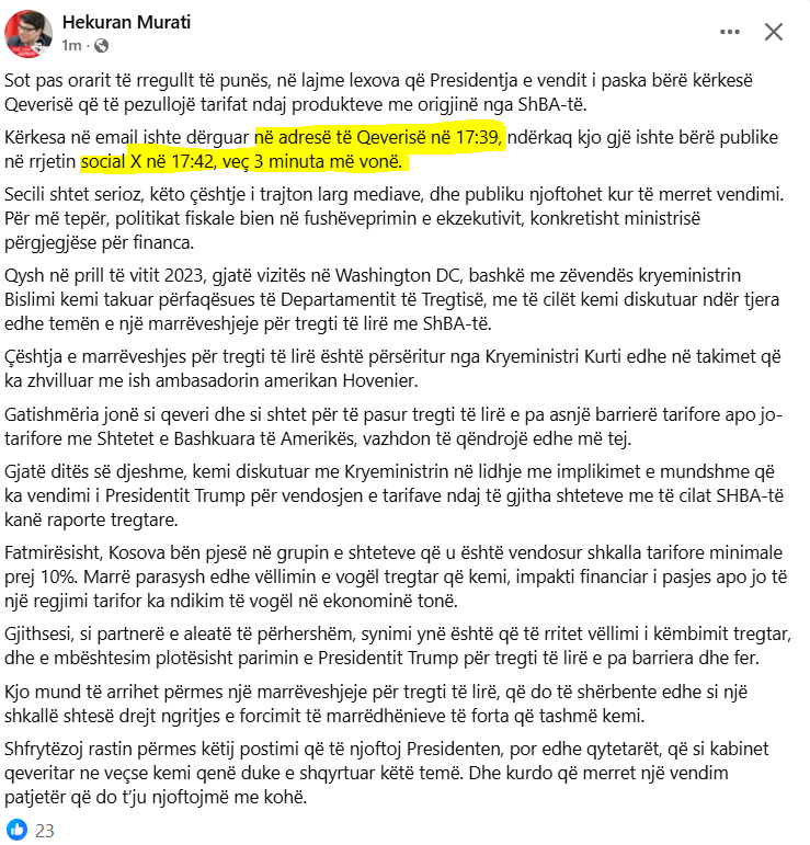 Hekuran Murati, Ministër në largim i Financave, e ka akuzuar dhe arsyetuar për publicitet atë çka bëri Presidentja e Kosaovës, Vjosa Osmani, me kërkesën për heqjen e tarifës prej 10% ndaj produkteve me origjinë nga Shtetet e Bashkuara të Amerikës.